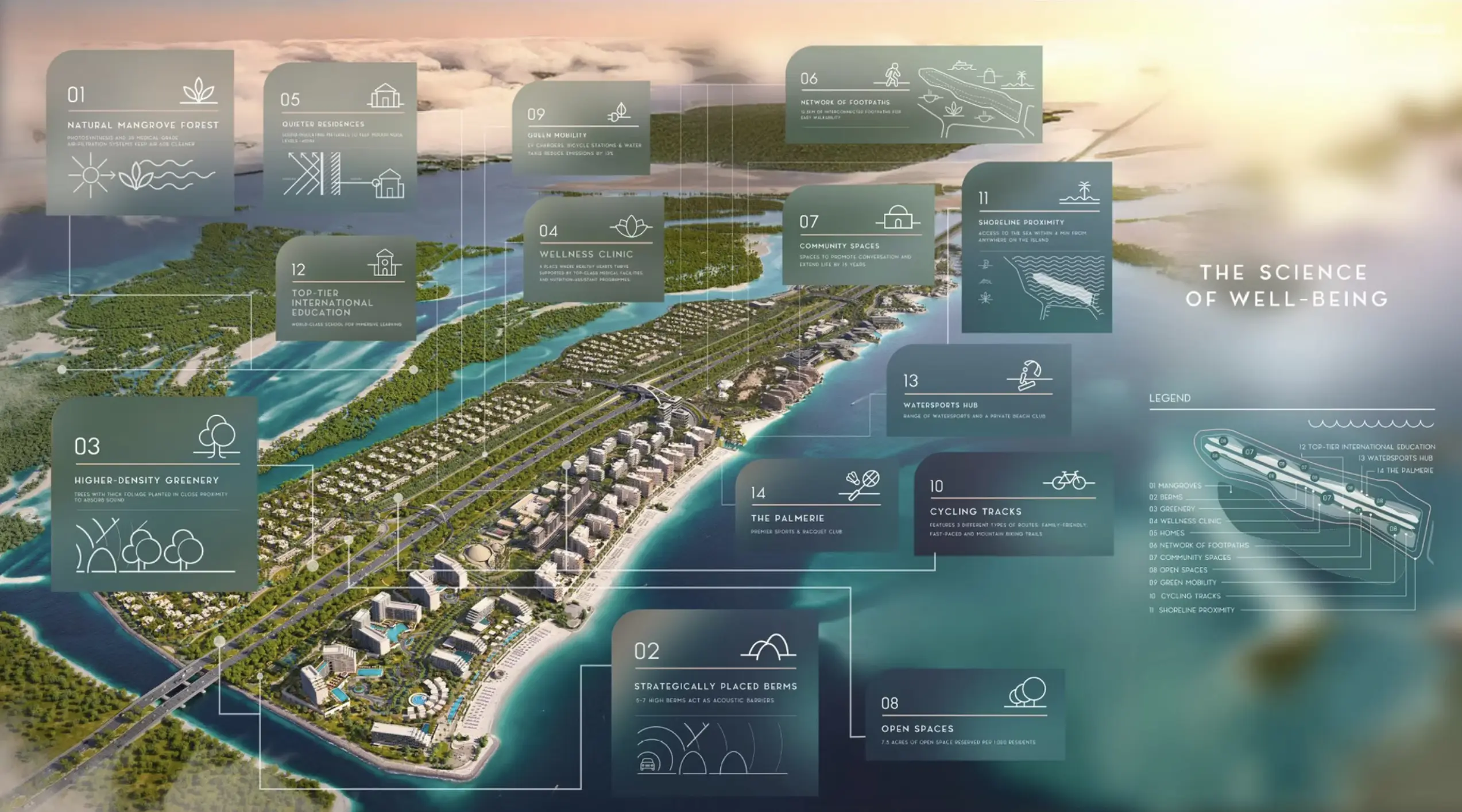 Anchored by the Beach & Water Sports Hub, the project activates the shoreline with year-round recreational opportunities such as kayaking, kite surfing, and beach volleyball. With 240 residential units, including lofts, apartments, sky villas, and penthouses, the scheme combines modern design, luxury living, and wellness amenities. Sustainability goals include achieving LEED Gold, Pearl 3 Building, and Fitwell certification, reinforcing the island’s identity as a model for healthy, waterfront lifestyles.