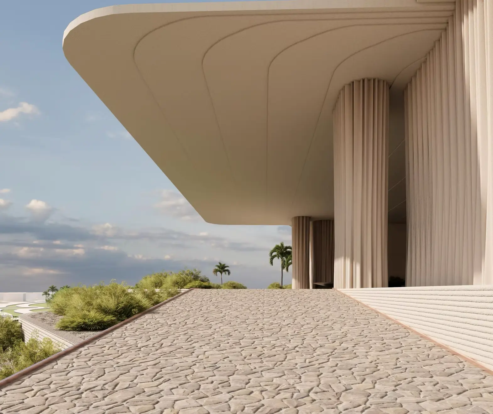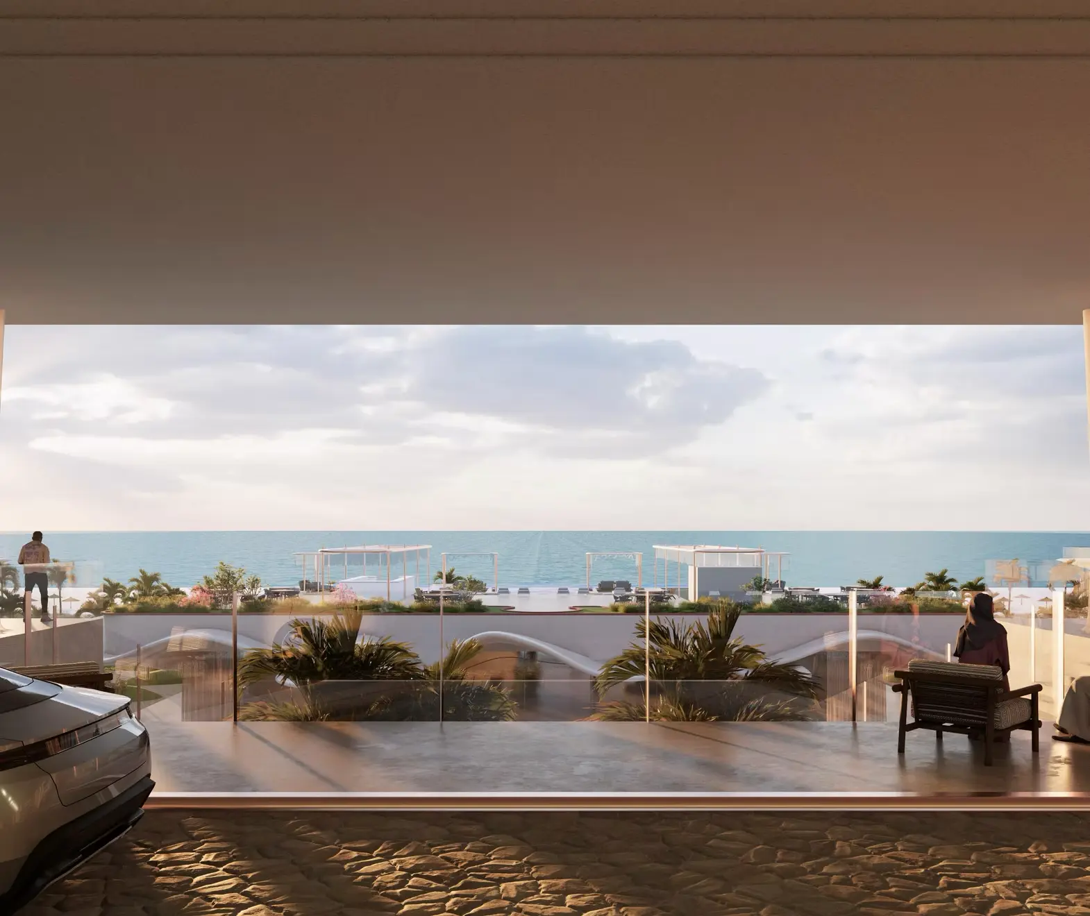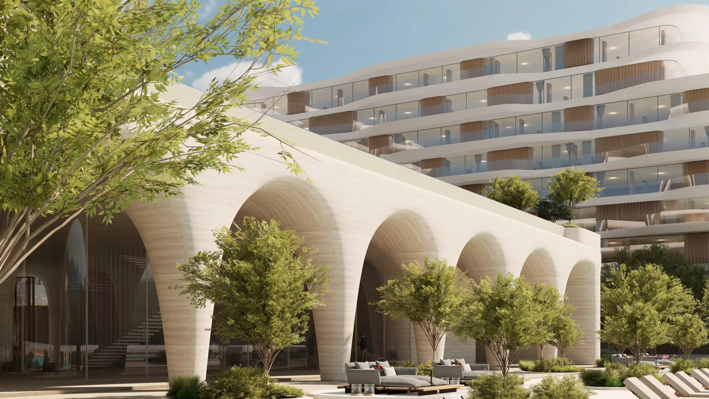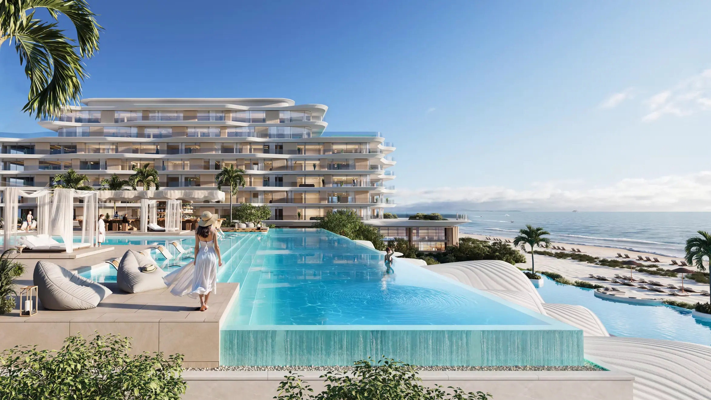 The masterplan integrates residences, penthouses, hotel rooms, and a beach club anchored by an infinity pool and landscaped courtyards. Visitors arrive through a layered sequence of lobbies, courtyards, and beachfront spaces, creating an immersive journey from urban edge to sea. A warm palette of travertine, GRC panels, bronze details, and flowing curtain-like elements reinforces the theme of elegance and coastal serenity.