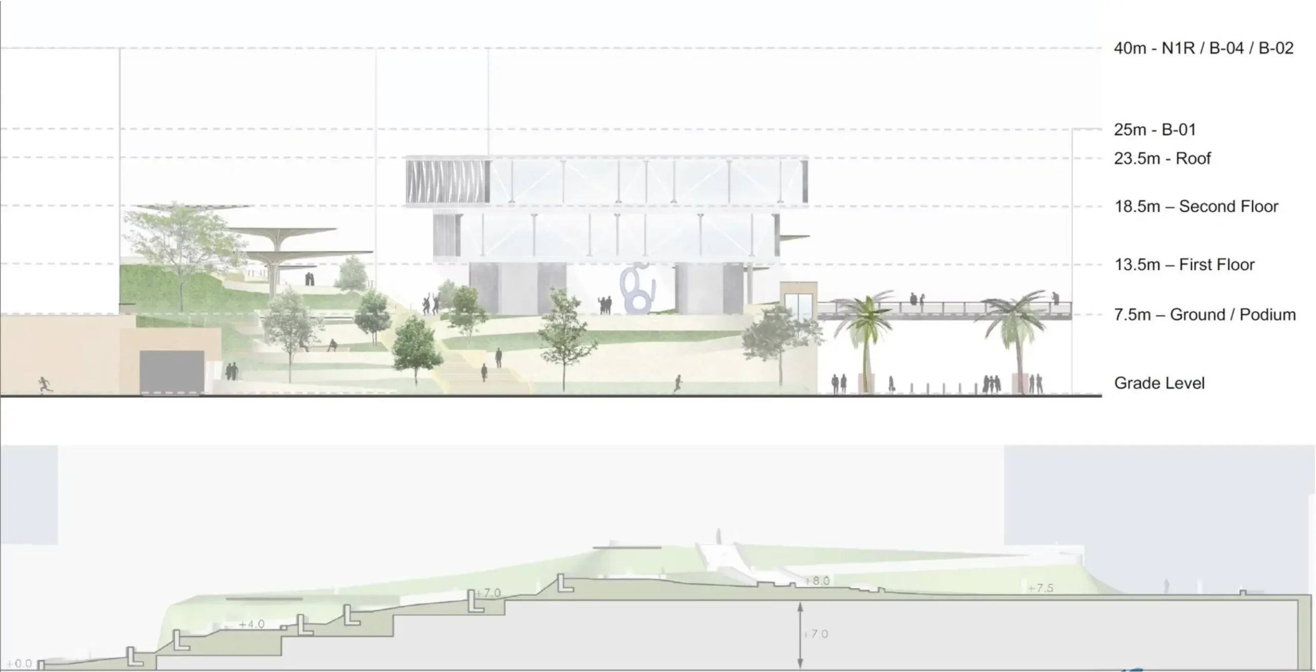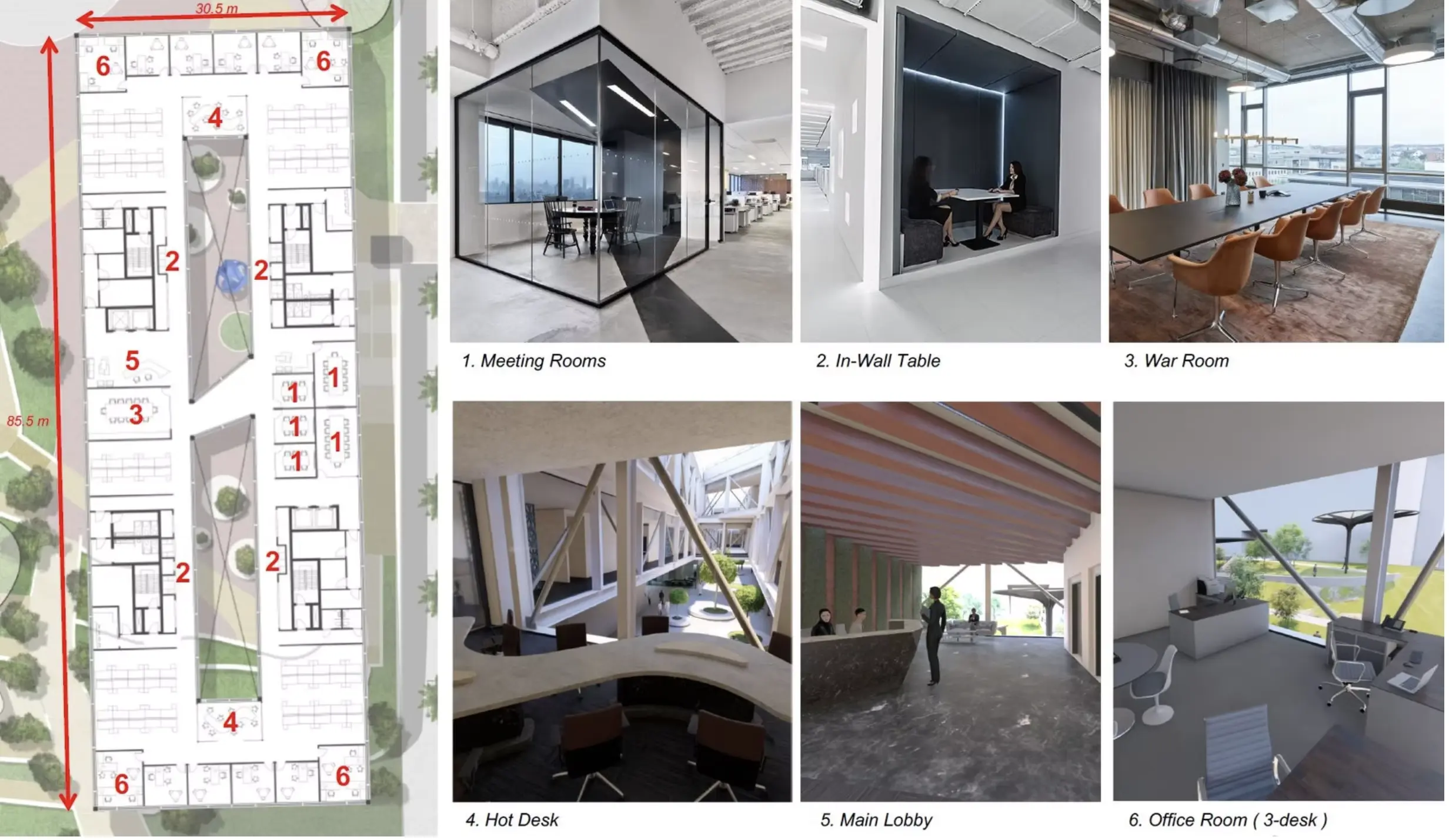 The project integrates flexible meeting rooms, hot-desking areas, war rooms, and collaborative zones, ensuring adaptability for diverse user needs. At grade, retail and boulevard activations strengthen connections with adjacent plots