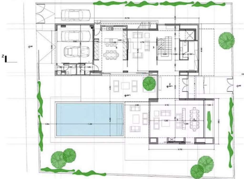 The design integrates open-plan living spaces with strong indoor–outdoor connections, highlighted by a central swimming pool and landscaped garden. Concept development was carried out using AutoCAD and SketchUp, emphasising minimal geometric forms, natural light, and a strong relationship between private and social areas.